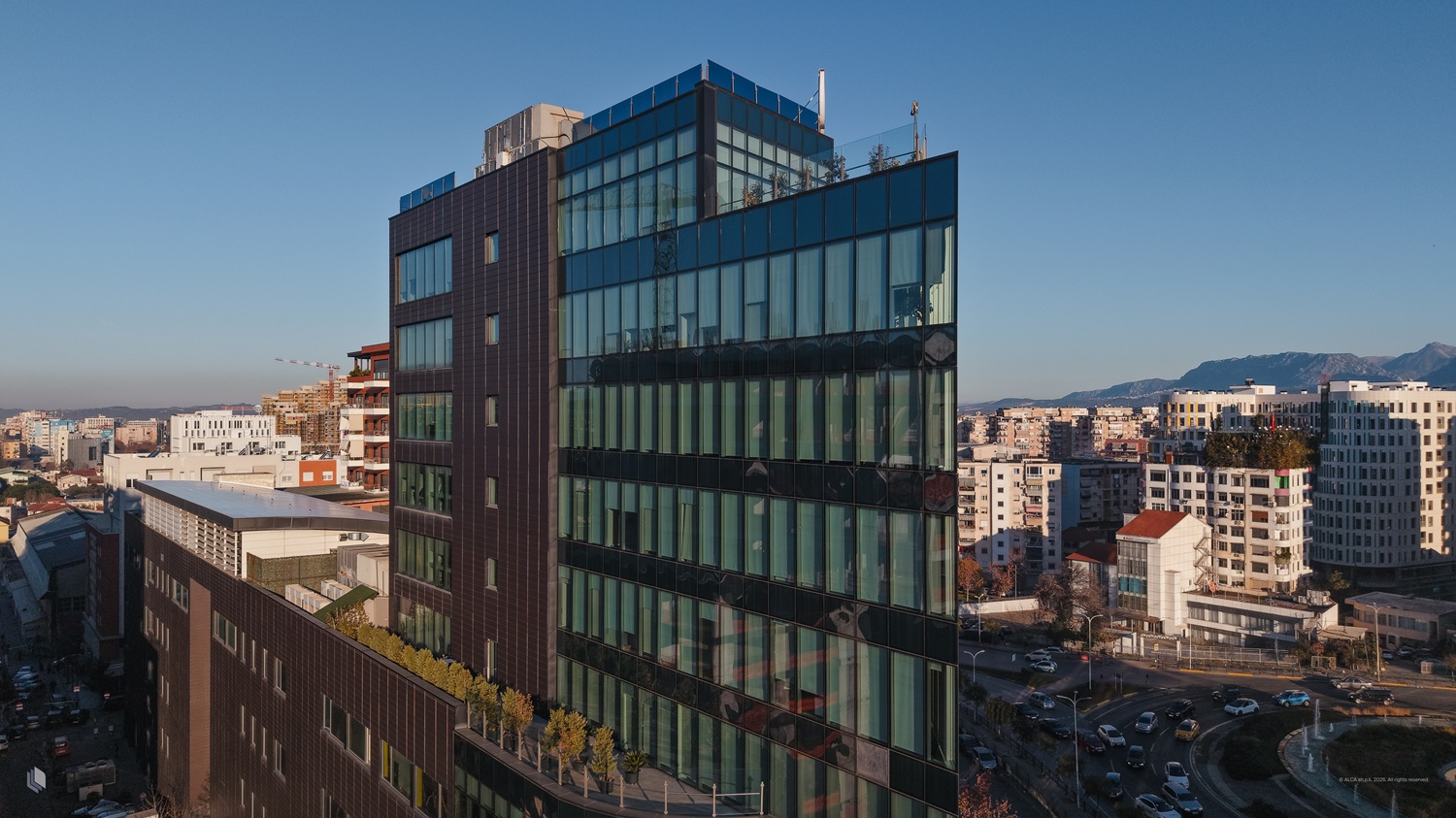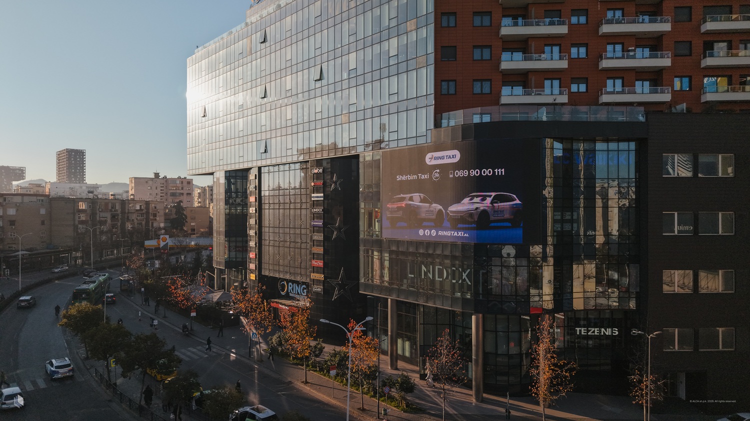 /Tirana Ring Center is a large-scale mixed-use development combining retail and residential functions. The façade incorporates stick curtain wall systems alongside integrated media screen structures.